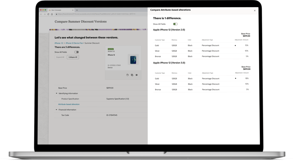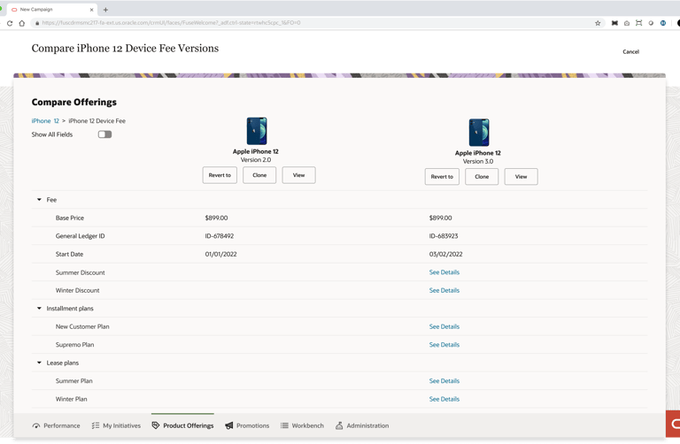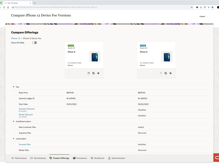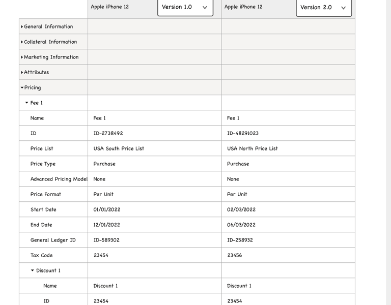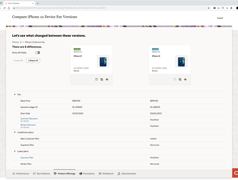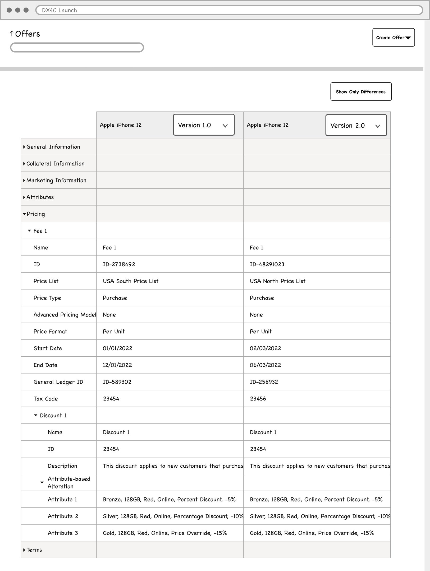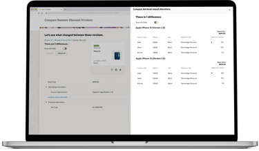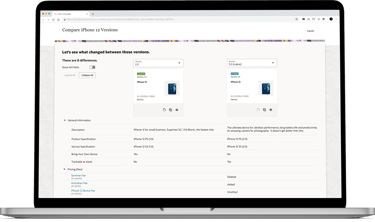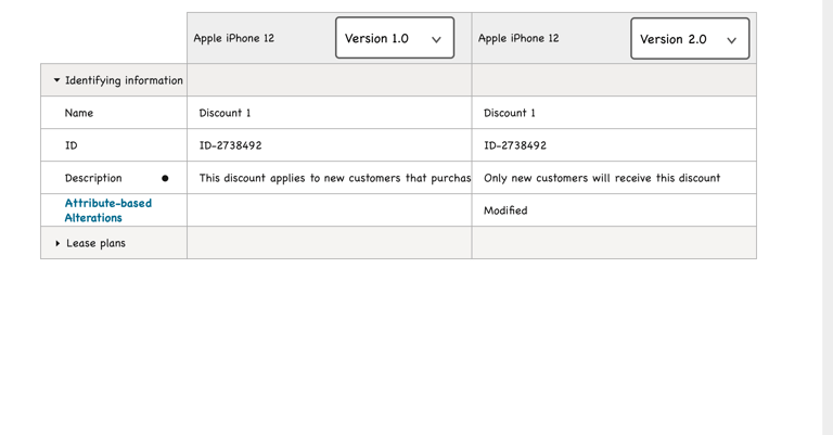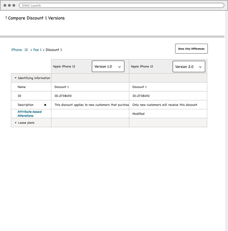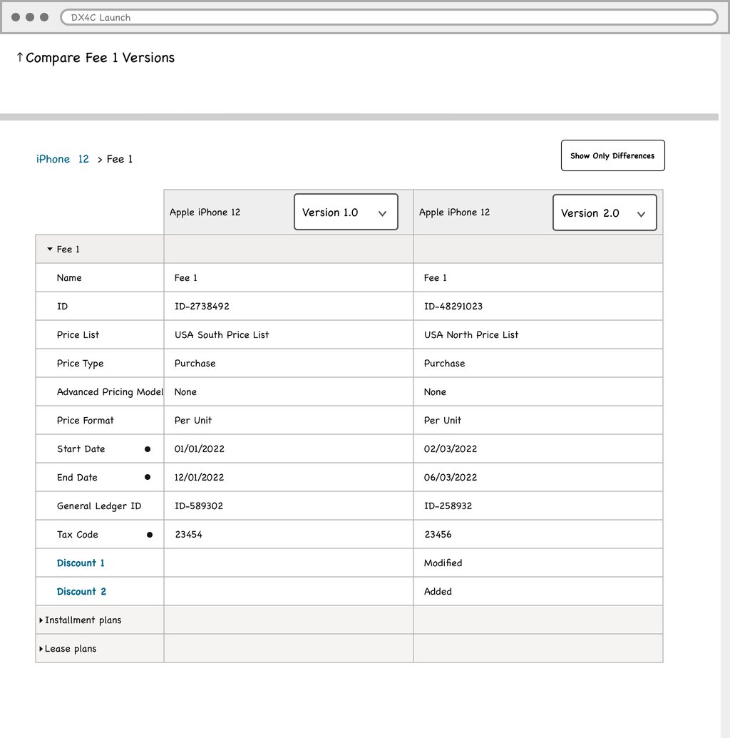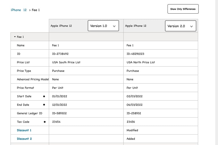 Product managers in the telecommunications industry work with catalogs that typically contain over 1000 offerings (devices, services, accessories etc.). The information pertaining to these offerings (ex. pricing, effective period, promotions) is distributed across multiple pages in the LaunchX system. To compare the differences between two different versions of an offering is no simple task. It requires either taking notes, flipping between tabs, or opening multiple browsers, which all present a heavy cognitive load on the user.