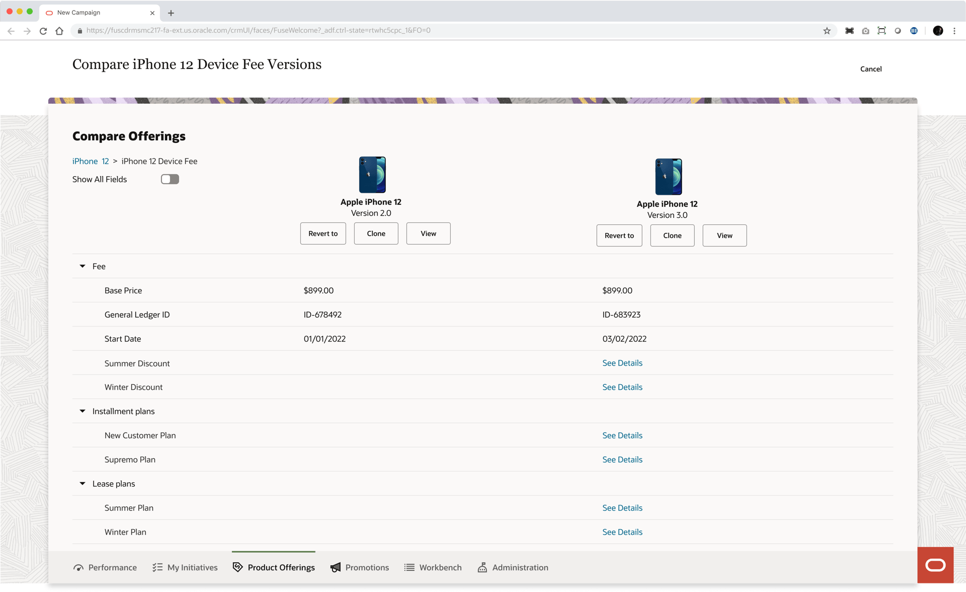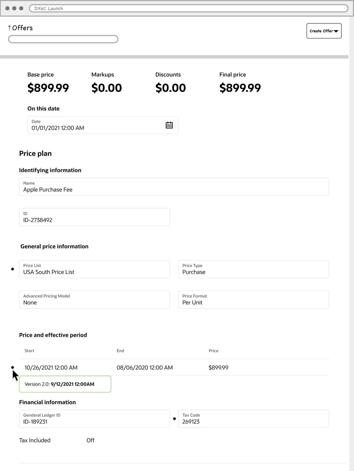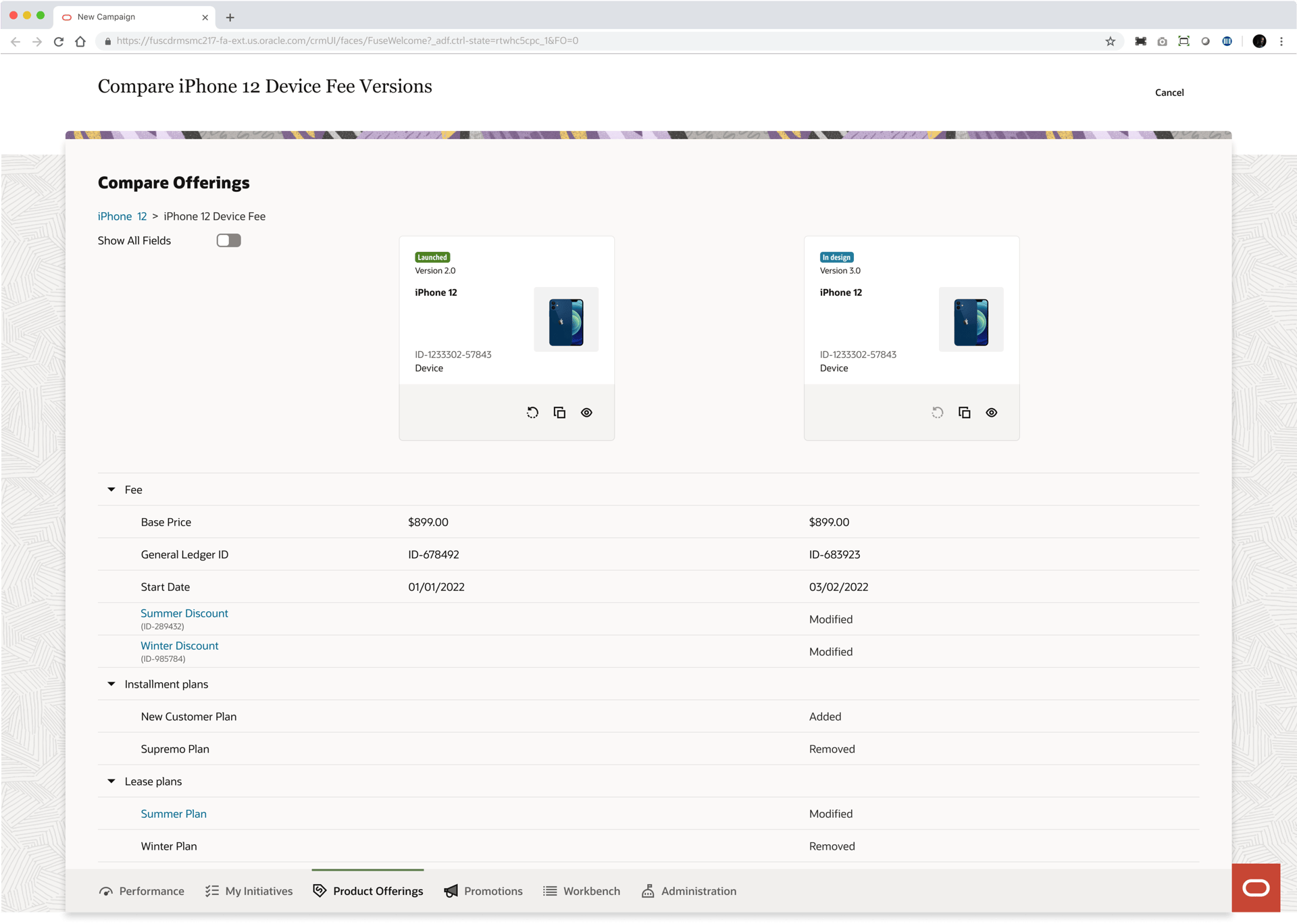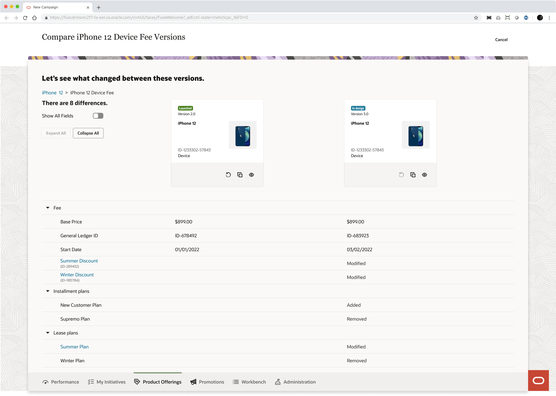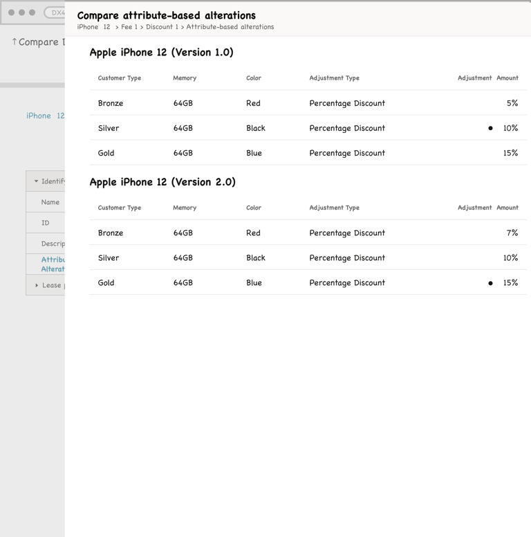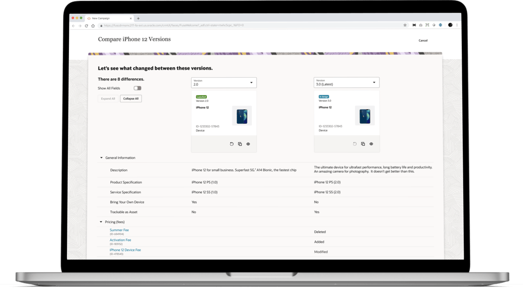 Product managers in the telecommunications industry work with catalogs that typically contain over 1000 offerings (devices, services, accessories etc.). The information pertaining to these offerings (ex. pricing, effective period, promotions) is distributed across multiple pages in the LaunchX system. To compare the differences between two different versions of an offering is no simple task. It requires either taking notes, flipping between tabs, or opening multiple browsers, which all present a heavy cognitive load on the user.