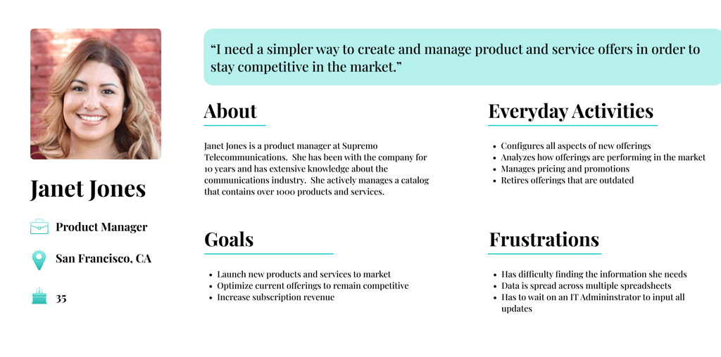 My initial plan was to conduct user interviews with the telecom employees that the Oracle product manager had interacted with in the past. Unfortunately, the product manager was unwilling to share his contacts with me. However, because he had extensive interaction with telecom employees and a good understanding of their needs, I was able to get my user research questions answered by him. I decided to organize this information into a user persona for easy reference of the goals and frustrations that I needed to address in my designs.