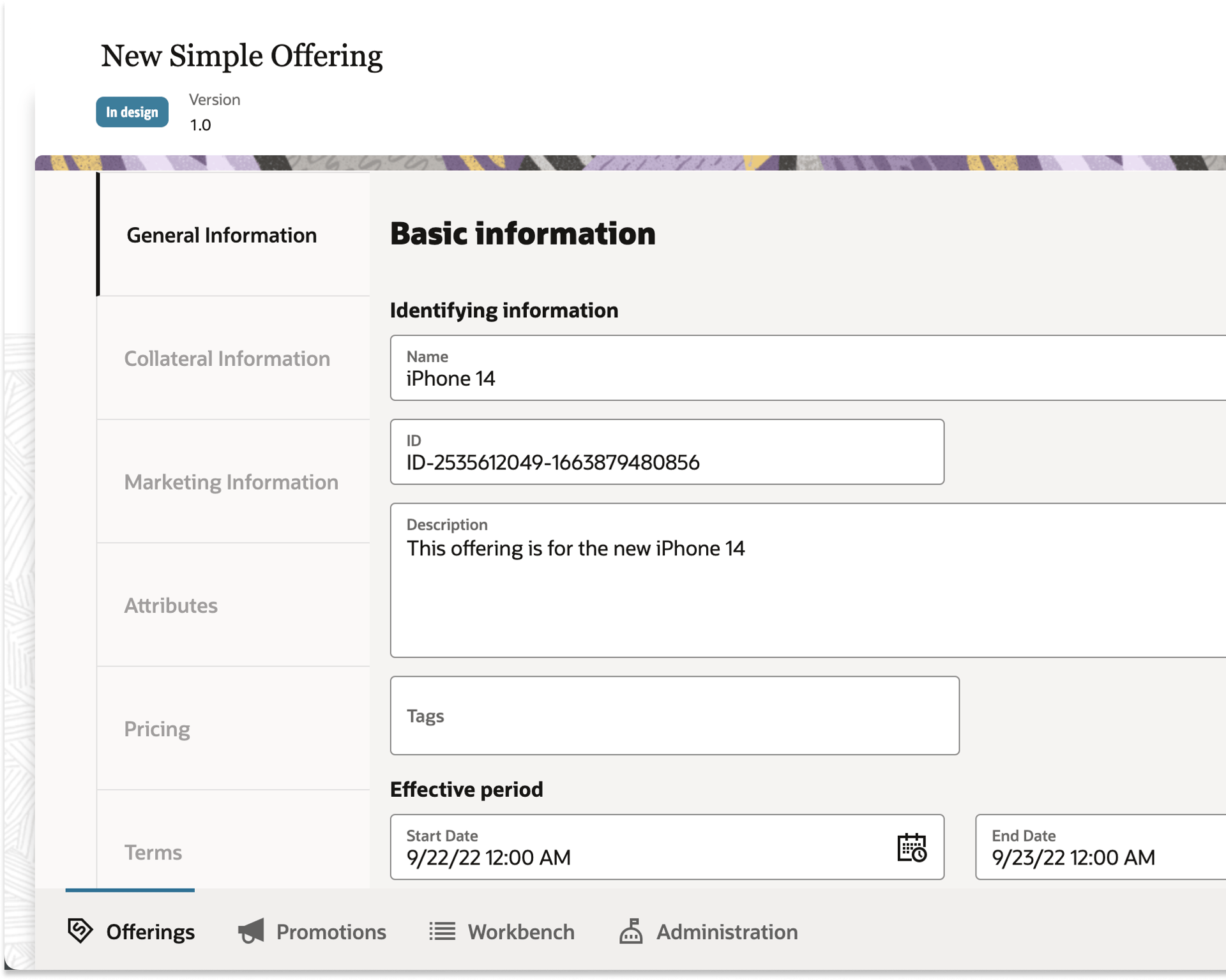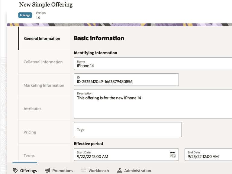 The information for an offering is organized into 6 different tabs: