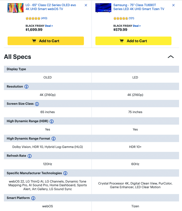 Given that product comparison tools have existed in other applications for quite some time, I wanted to understand the conventions I should follow when creating my own design. I did this by reading online articles, including one written by the Nielsen Norman Group. Some of the best practices that I discovered, included: